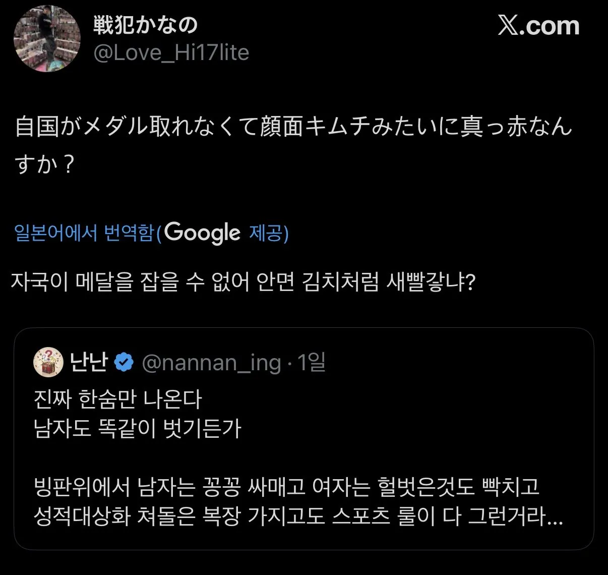 트윗에서 화제인 일본피겨 사진 댓글 0 02.19 20:50 작성자 : 네이마르로 좋아요 팔로우 게시글 보기 이번 피겨 남녀혼성 일본 팀 사진이 뉴욕포스트에 실리면서 처음엔 ‘헐크같다‘ 면서 화제가 됐는데 이 한국 트윗을 시작으로 수많은 리포스트가 이어지며 다른 의미로 화제가 됨 남녀 복장논란으로 떡밥이 전환되면서 불이 붙어버림 참고로 바지입는다고 점수 감점된다는건 그들만의 주장 복장은 선수들이 골라오며 피겨 복장이 이뻐서 시작했다는 선수들도 많음 아래는 원본 피겨팀의 본진인 일본트윗 네이마르로님의 최신 글 02.19 트페미들이 지랄했던 권은비 워터밤 02.19 위에서 본 뽑기하는 일본녀 02.19 평점 높은 모찌의 탄력 02.19 코스프레 하는 사람들이 겪는 고충 02.19 분수처럼 터지는 물.. 마시는 처자 02.19 레슬링 승부조작 레전드 02.19 Ai와 실제 미녀를 구분하기 테스트 02.19 치어리더중 유일하게 닉값 잘하는 분 02.19 후방) 흔한 모바일게임 스킨 02.19 오늘자 정말 엄청난 모모 ㅗㅜㅑ